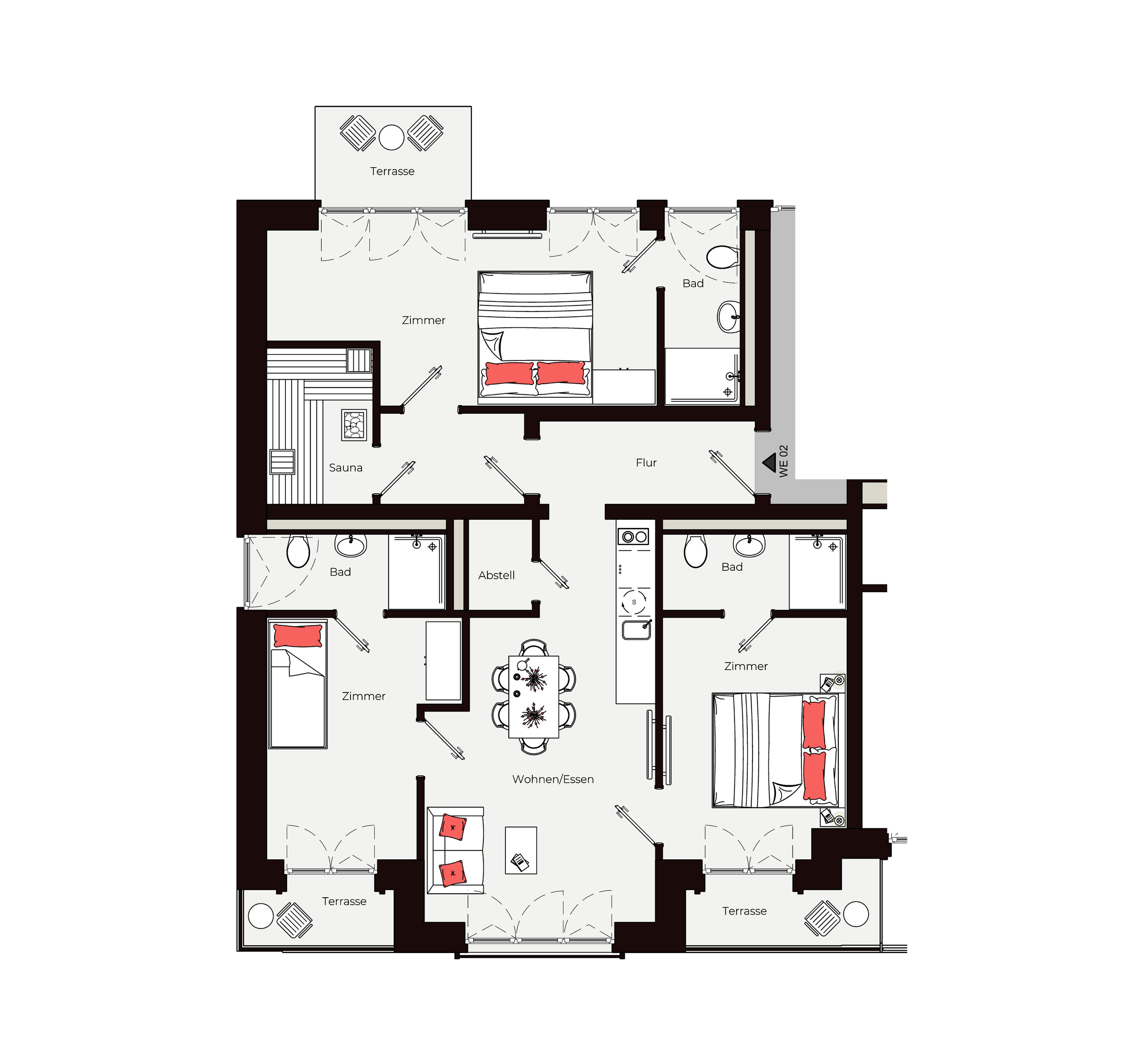 Auf 85 m² bietet dieses Apartment viel Raum für gemeinsames Erleben. Drei Schlafzimmer und drei Bäder machen es ideal für Familien oder Freundeskreise, die Wert auf Privatsphäre legen. Helle Räume, klare Linien und die private Sauna sorgen dafür, dass Erholung und Geselligkeit Hand in Hand gehen. Die großzügigen Terrassen laden ein, draußen zu frühstücken oder den Tag ausklingen zu lassen. Zentral gelegen und dennoch ruhig, ist dieses Apartment ein idealer Ausgangspunkt für alle, die Büsum entdecken und sich abends zurückziehen möchten.