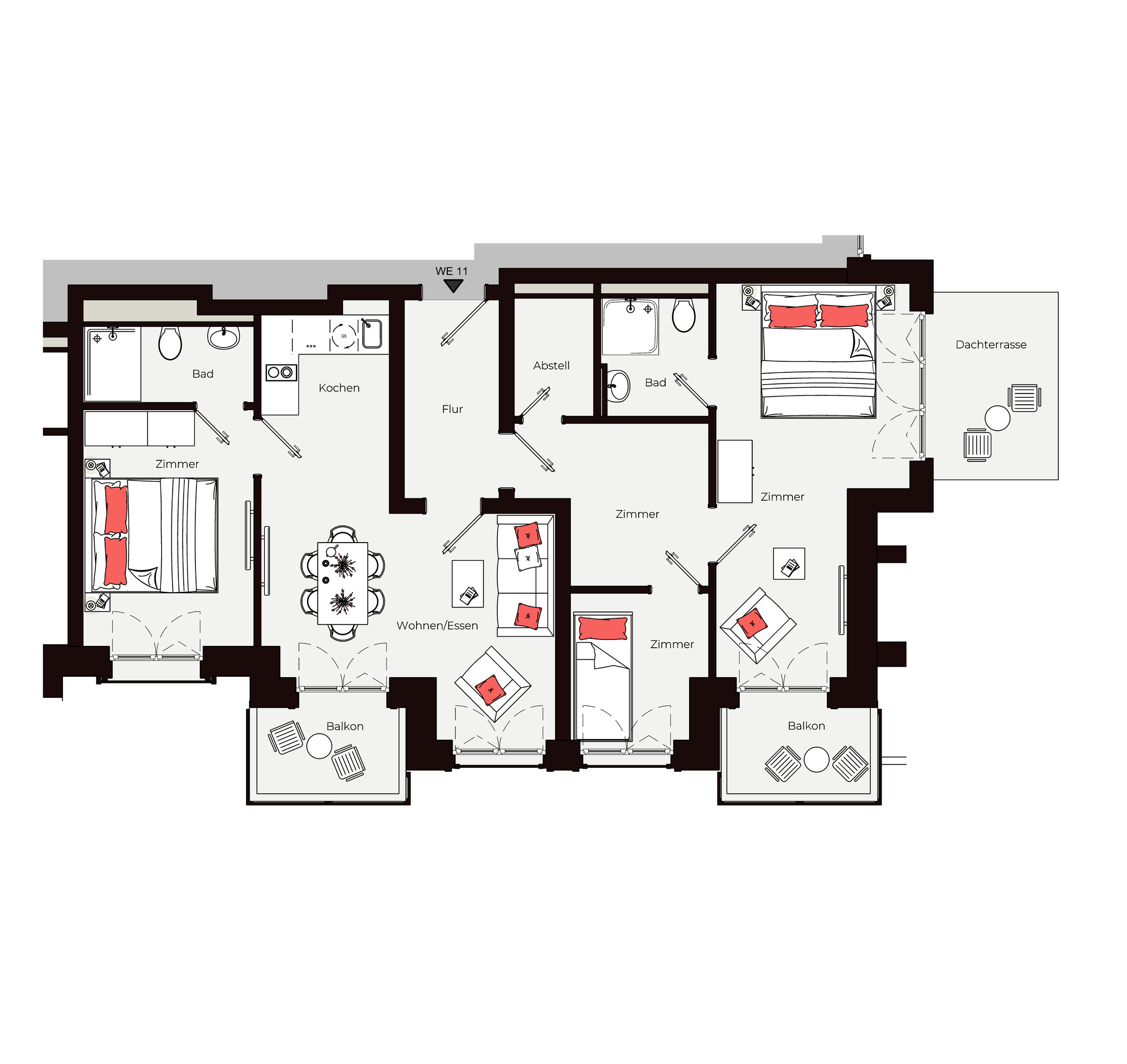 Auf 80 m² entfaltet dieses Apartment seine ganze Wirkung. Zwei Schlafzimmer (eins mit Doppelbett, eins mit Stockbetten), zwei Bäder und ein weitläufiger Wohnbereich machen es zu einer idealen Wahl für Familien sowie Paare, die sich viel Raum wünschen. Drei Balkone öffnen den Blick nach draußen und schaffen kleine Wohlfühloasen mitten im Ort. Modern und zugleich behaglich, bietet dieses Apartment die perfekte Mischung aus Privatsphäre und Gemeinschaft.