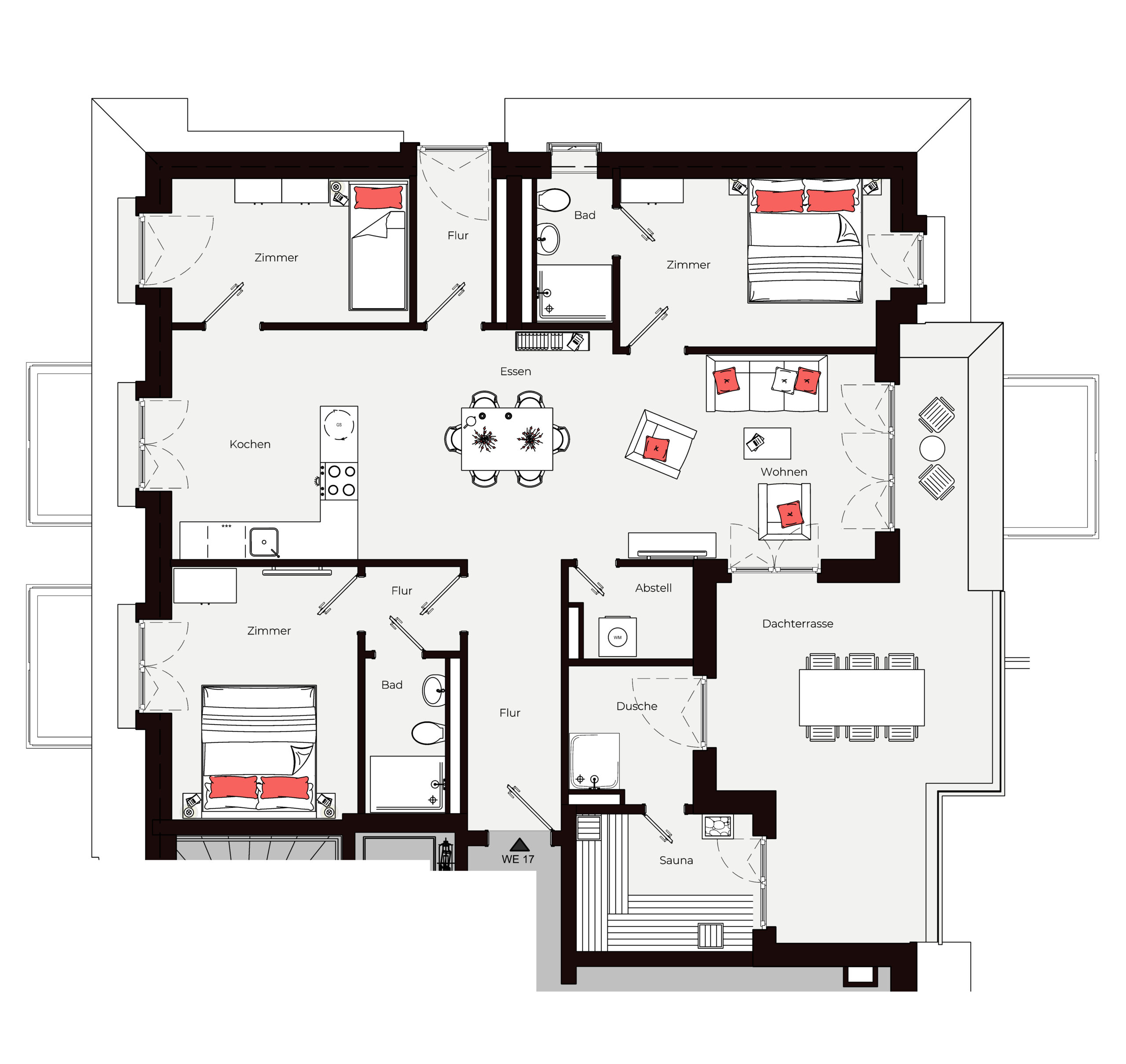 Mit 115 m², drei Schlafzimmern, zwei Bädern und einem großzügigen Wohnbereich ist dieses Apartment ein wahres Refugium. Die Dachterrasse öffnet den Blick über Büsum, während die private Sauna nach langen Tagen am Meer für Entspannung sorgt. Ideal für Familien oder Freundesgruppen, die Raum für sich und gleichzeitig ein gemeinsames Zuhause suchen. Hier verschmelzen Design, Großzügigkeit und Lage zu einem unvergleichlichen Erlebnis. Ein Apartment, das keine Wünsche offen lässt.